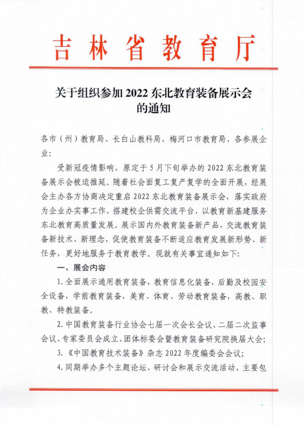 吉林省教育廳關(guān)于組織參加2022東北教育裝備展示會的通知