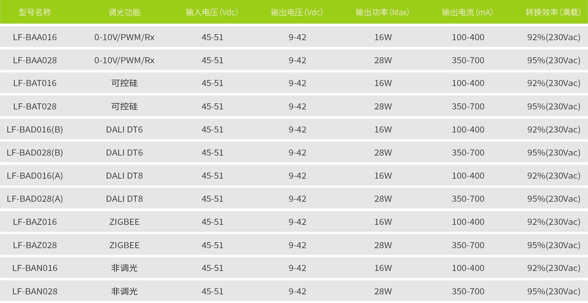 各系列擁有16/28W兩款型號(功率范圍5-28W),輸出電壓9-42V,輸出電流覆蓋100-400mA / 350-700mA,且電流50mA一檔撥碼可調,讓產品備貨更方便。