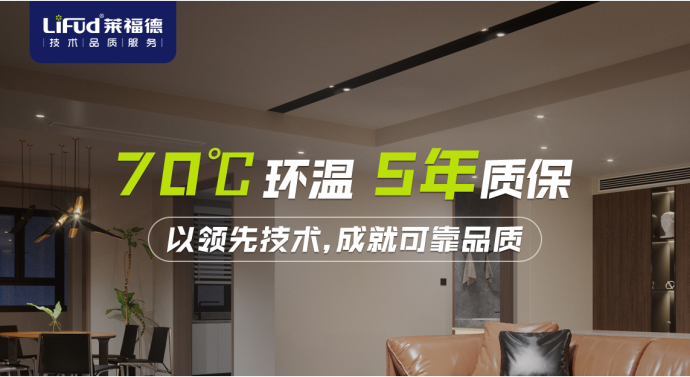 在該產品參數定義期,萊福德對燈具各種極端使用情況進行了模擬并收集相關參數。其中,在測試長期點亮的燈腔溫度時發現,其內部環溫可高達65℃以上,而市面上產品最高耐溫也僅60℃,于是為給客戶提供一款真正能完全放心內置使用的筒射導軌燈電源,在攻克層層技術難題后,萊福德70℃耐高溫系列成功上市。