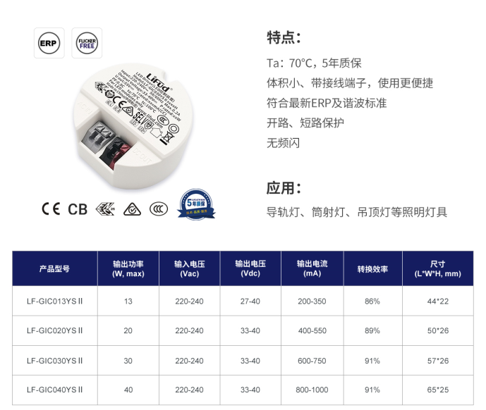 LF-GICxxxYS II(8-40W)為灌膠設計,可應用在Ta70℃,Tc90℃的環境下(常用于燈腔內置),輸入電壓范圍220-240Vac,輸出功率8-40W,滿足市面大多數導軌筒射燈應用需求。