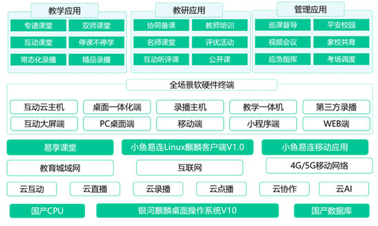 小魚易連聯合麒麟軟件推出的教育行業全融合視頻互動平臺解決方案,以銀河麒麟操作系統為支點,以小魚易連云視頻互動技術為核心,全面支持國產軟硬件設備,具備更優良、更安全的系統運行環境,為教育新基建提供堅實可信的基礎支撐。