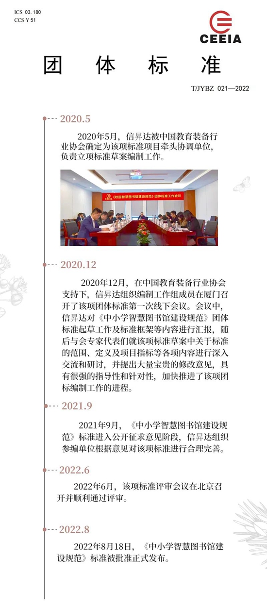 根據中國教育裝備行業協會2022年8月18日發布的《中國教育裝備行業團體標準公告2022年第1號》公告顯示,由中國教育裝備行業協會歸口管理、福建信昇達智能科技有限公司牽頭起草的團體標準T/ZYBJ 021-2022《中小學智慧圖書館建設規范》(以下簡稱標準)被批準正式發布。