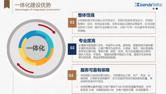 信昇達以實現圖書館館藏借閱研休為目的,以校園文化底蘊為設計思路,在校園圖書館的整體規劃、設計裝修、系統建設、運營管理等各個階段提供整體解決方案,盡享一站式服務帶來的高效便捷;一體化建設不僅能夠滿足中小學圖書館達標建設,更能打造一座體現學校辦學理念、展現校園文化特色的現代化、智能化校園圖書館,推動師生閱讀,共建書香校園。