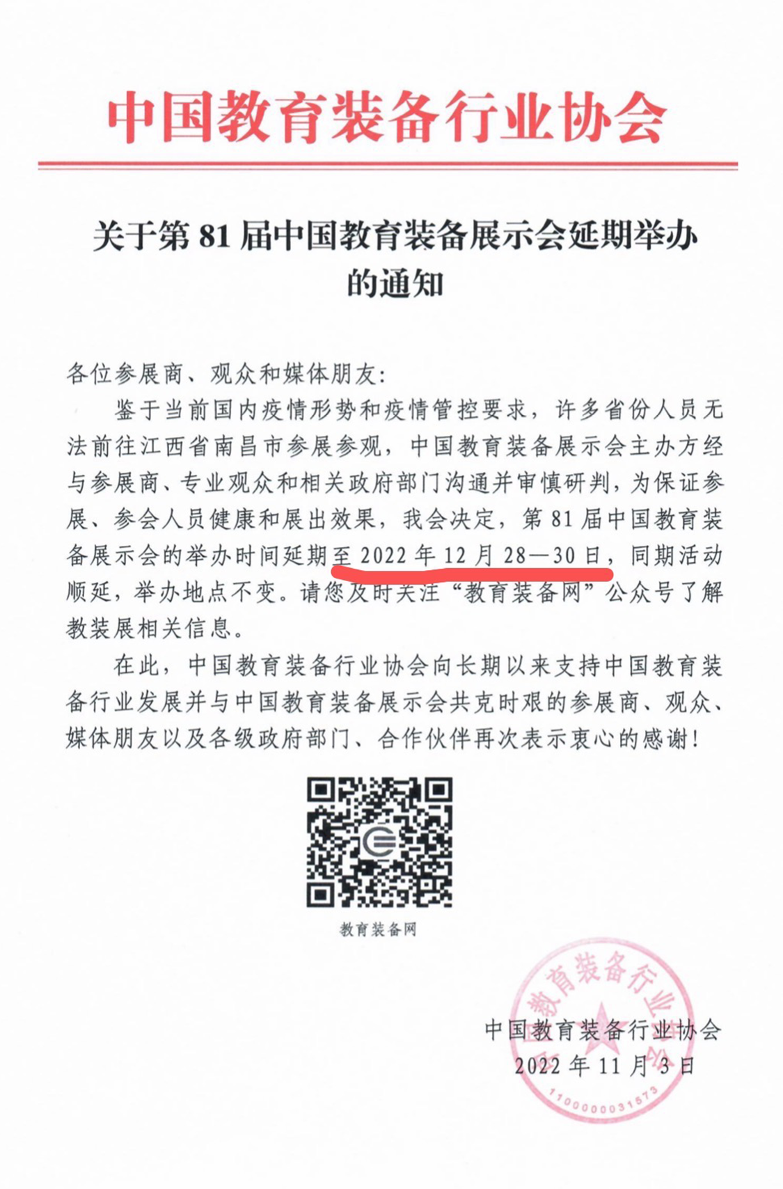 受疫情影響,昨日中教協發函通知,原定于2022年11月18-20日舉辦的第81屆中國教育裝備展示會,延期至2022年12月28-30日!由此給您造成的不便,我們也深感抱歉,期待與您再次相約!