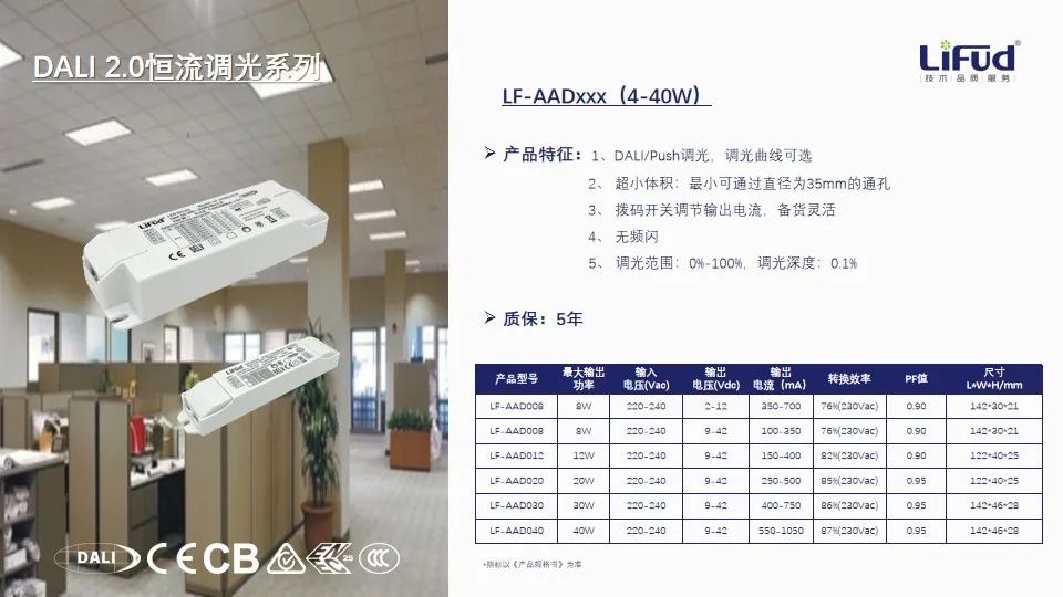 針對恒壓燈帶、燈箱及其他裝飾照明應用,萊福德DALI擁有二合一(DALI/PUSH)調光&調光調色、五合一(DALI/PUSH/0-10V/Rx/PWM)調光兩大系列,其最高效率都可達到93%,遠超市面同類產品,助力燈具高效節能。