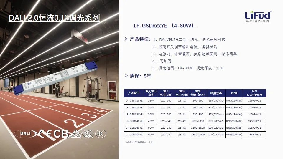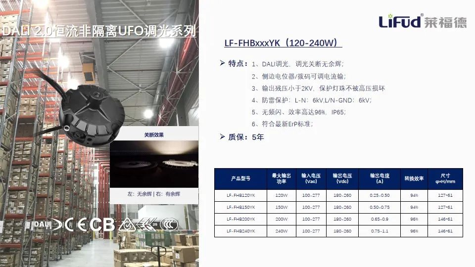 針對工業照明場景,萊福德DALI非隔離UFO調光系列效率可達96%,為DALI2.0標準,調光過程平滑無頻閃,且可實現調光關斷無余輝。
