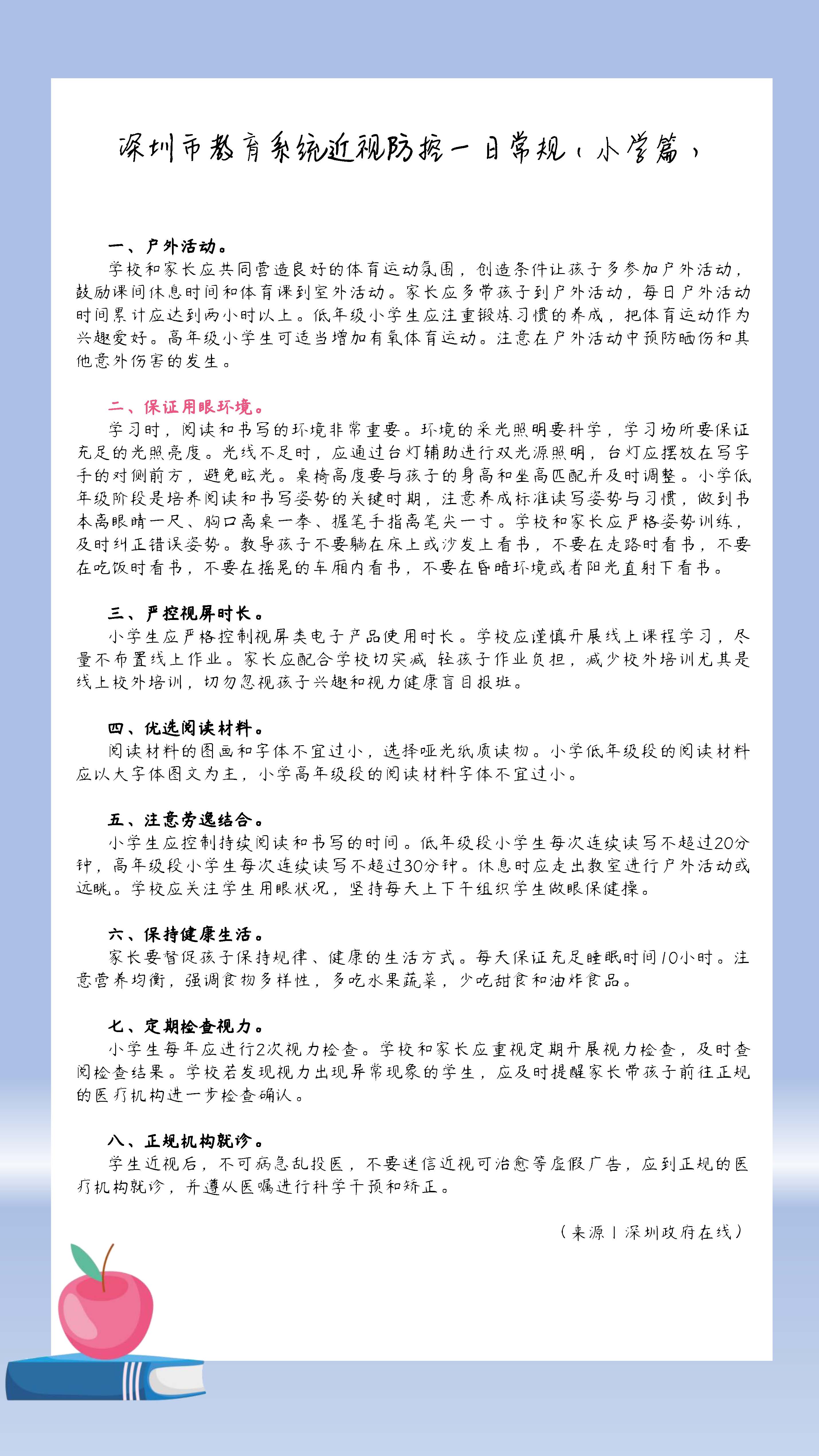 深圳市教育系統近視防控一日常規(小學篇)