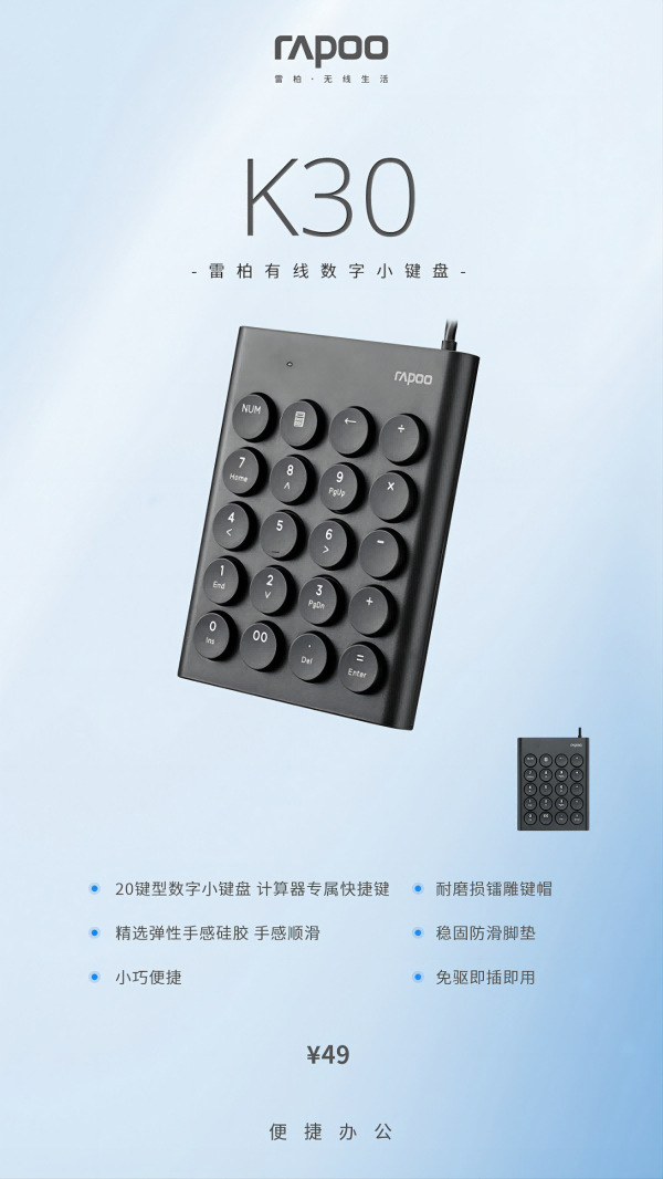 雷柏K30有線數字小鍵盤用便攜+實用+性價比為設計語言助力商務辦公人群工作效率一刻。官方指導價49元,現已上市!