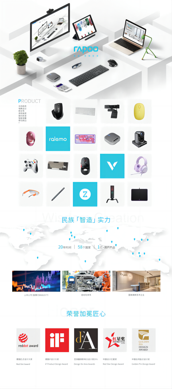雷柏連年受邀參加德國IFA、美國CES等全球消費電子大展,展現新國貨魅力。屢獲德國IF設計獎、德國Reddot紅點設計大獎、日本G-Mark設計獎、亞洲DFA最具影響力設計獎、中國創新設計紅星獎、中國臺灣金點設計獎等國內外權威設計獎,讓3C硬件重塑新動力與新方向,重構想象。向世人展現新國貨的標桿實力。