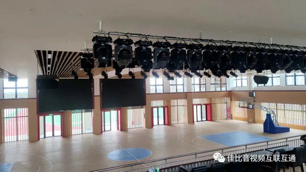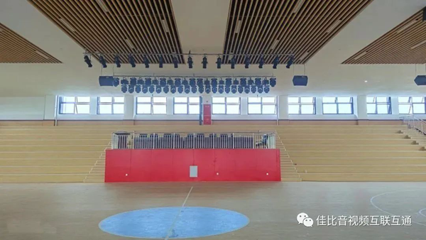 體育館主要是學校舉辦藍球賽事、開展學生體育活動主要場館,設置了主席看臺、觀眾看臺、。JUSBE(佳比)結合場館環境及使用需求,為該場館設計了一套專業擴聲音響、舞臺燈光,為該校學生提供豐富的健身運動條件。