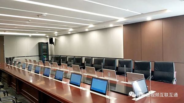 24個點位的無紙化會議終端采用JUSBE(佳比)15.6寸超薄升降器(帶話筒),IPS全視角液晶屏,支持10點電容觸摸,不使用時可將屏幕升降隱藏于箱體內部,不占用桌面空間。升降器支持獨立升降,可實現顯示屏和話筒同時升降,也可以單獨升降顯示屏或話筒,滿足不同的會議使用需求。