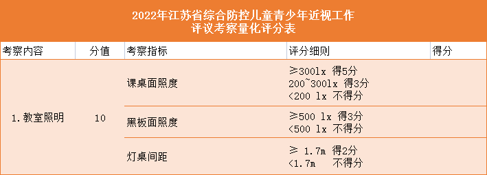 健康的光環(huán)境作為兒童青少年近視防控中關(guān)鍵的一環(huán),越來越得到社會(huì)各界的重視。在江蘇省教育廳印發(fā)的《2022年江蘇省綜合防控兒童青少年近視工作評(píng)議考察和視力監(jiān)測(cè)方案》中,對(duì)課桌面照度、黑板面照度、燈桌間距等做了明確規(guī)定和要求,更是將教室照明考核分?jǐn)?shù)量化為整體的10%。