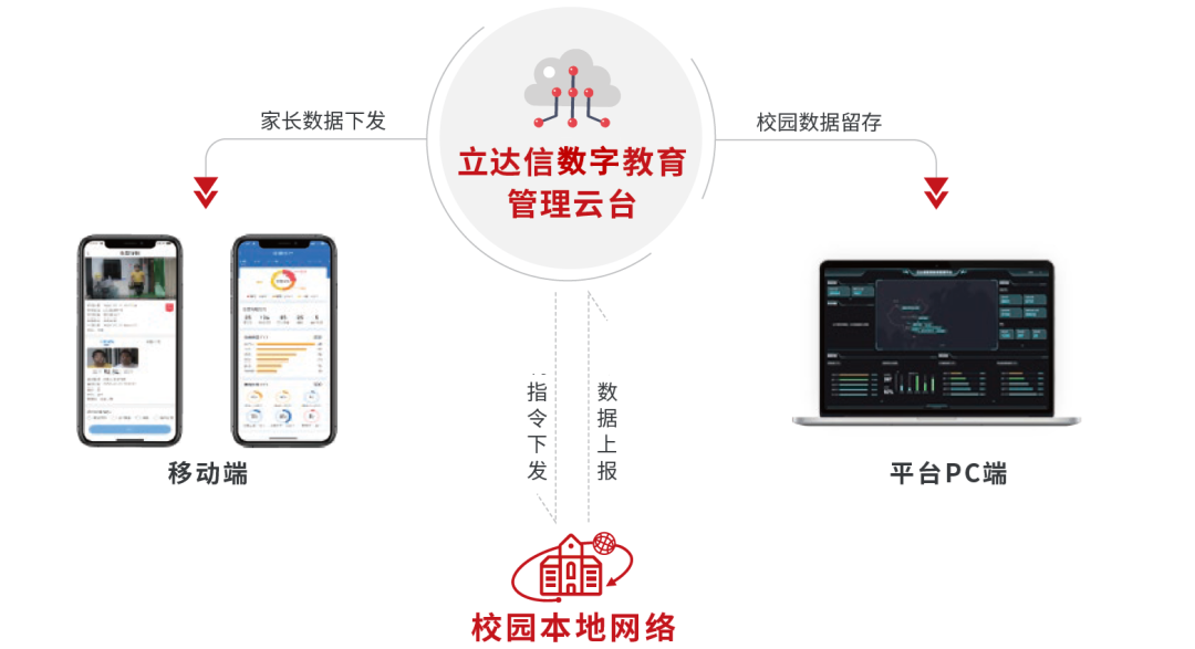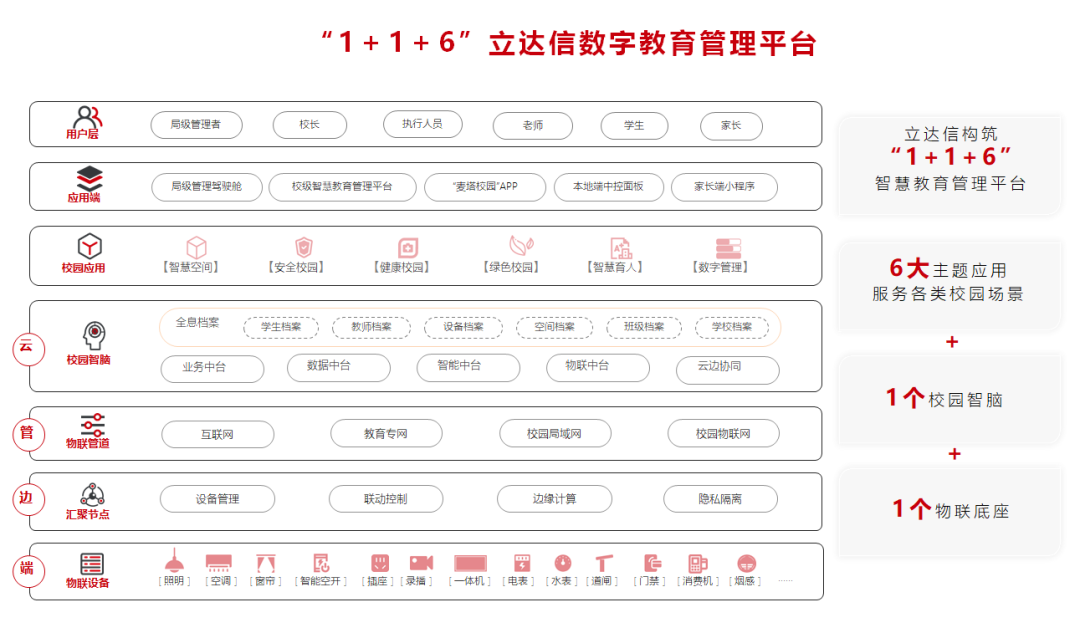 數字化底座作為數字校園建設中樞系統,立達信圍繞“硬件全場景、教育大生態、數字大平臺”的布局、先進的物聯網技術與智能化改造經驗,打造覆蓋教育全場景的數字化平臺底座,并為各學段提供“萬物互聯、人機互動、數實互融”的軟硬一體化產品和應用,消除學校數據孤島,實現信息化賦能,助力提升學校教書育人效率及管理效能。