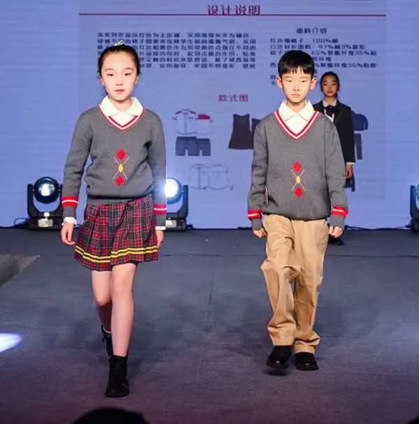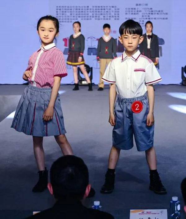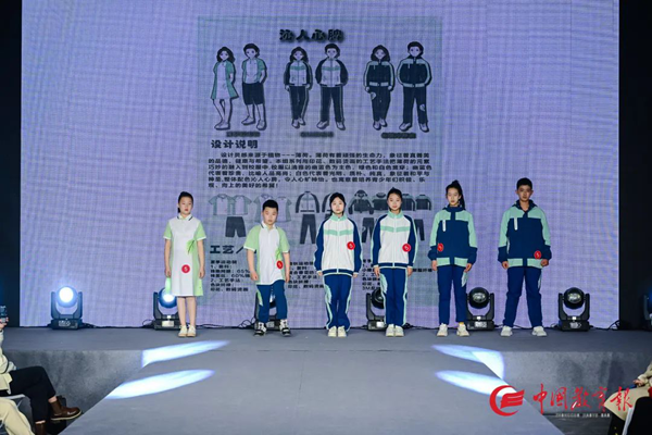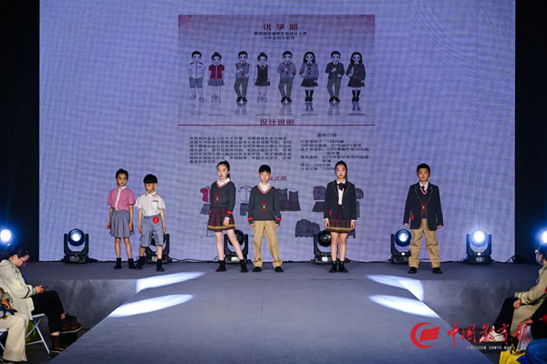 本屆設計大賽以“衣以載道、以美育人”為主題,現場展示了包含中小學運動裝、中小學制服裝、教師職業裝五個類別共計300個系列作品。