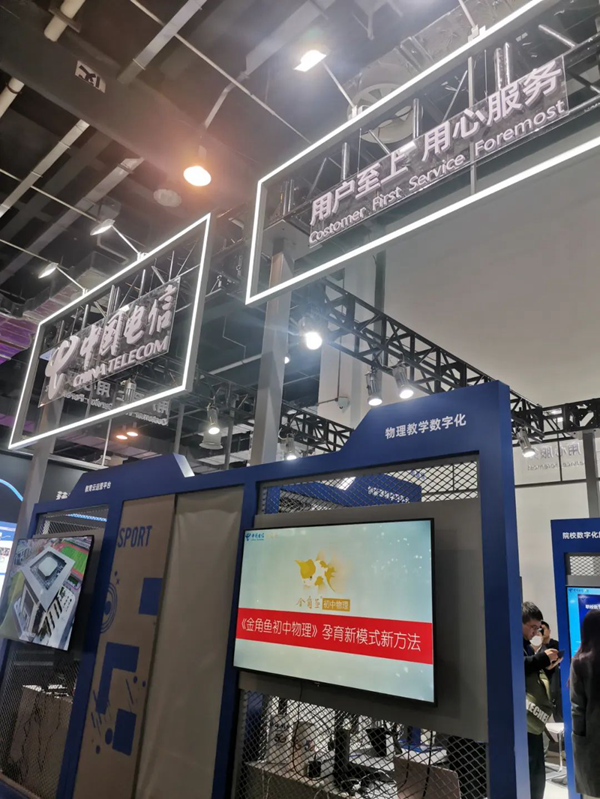 中國電信攜金角魚參加本次博覽會。金角魚以“物理教學的數字化轉型”為特色,為中國電信上海公司教育數字化轉型整體方案增添了價值、貢獻了力量。