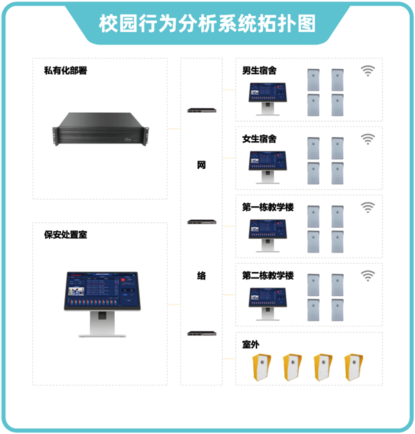 AI校園行為分析反霸凌系統,由校園行為分析管理中心、預警終端、處置終端構成。可部署在宿舍、衛生間、教室、走廊等攝像頭無法覆蓋的安全盲區,當預警終端設備監測到“救命”、“打架”、“打他”等呼救敏感關鍵詞,實時觸發報警功能,通過處置終端通知學校安保人員,實施廣播驅離,及時震懾欺凌,將事后追溯轉變為事前預警及事中干涉。