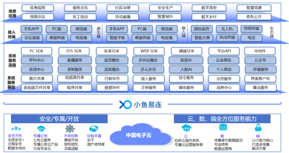 小魚易連作為中國電子云數字化生態的戰略合作伙伴,是中國電子云數字服務產業布局強鏈補鏈的重要云視頻抓手,依托中國電子云架構,小魚易連通過全自研底層技術,構建全天候、全可視、全調度、全覆蓋的可信云視頻解決方案,為數字政府、數字治理、數字金融、企業數字化等全面賦能。