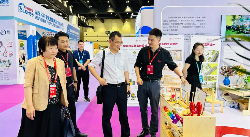 河南省教育資源保障中心仝志賢副主任、鄭州幼兒師范高等?茖W(xué)校學(xué)前教育學(xué)院梅納新院長(zhǎng)參觀俐文展區(qū)。