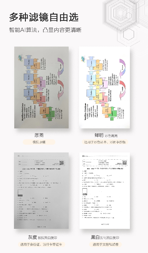 對于學生黨而言,經常需要復印試卷或是同學的課程筆記,這時候只需要拍下這些資料上傳到愛普生云打印小程序,就能通過小程序讓L125X實現復印操作。小程序采用了智能AI算法,通過不同濾鏡讓內容更清晰,致力于使每一次文檔的還原都高度貼近真實的復印效果。去底紋效果讓雙面文檔智能去除背面墨跡,讓文件更清晰;全彩處理優化功能則讓圖片轉文檔的色彩豐富,還原度極高。