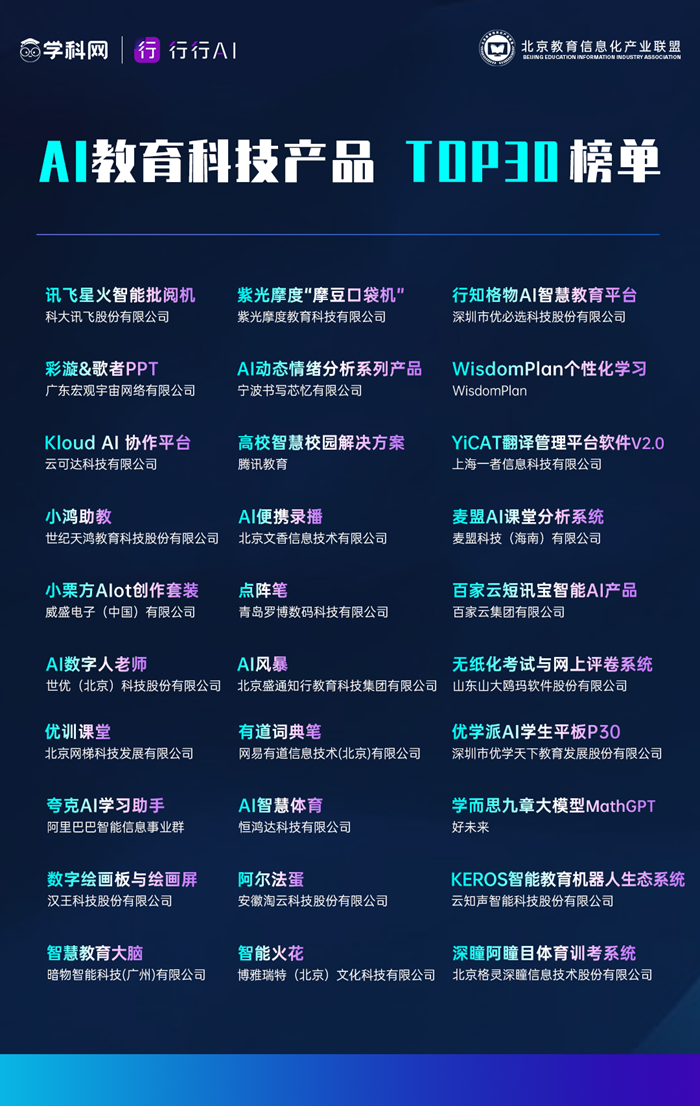論壇發布AI教育科技產品TOP30榜單,匯集了創新的AI教育產品案例,表彰其在人工智能教育領域的創新應用成果(詳情見下方榜單圖片)。