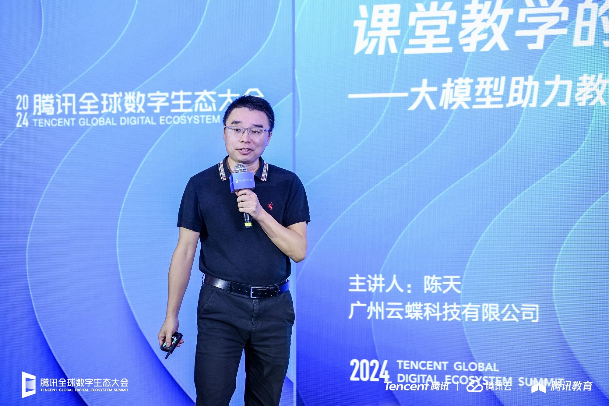 在數智教育專場活動中,陳天博士受邀作主題演講。他以大模型助力教師發展為主題,介紹了以提升教育教學質量與教師工作效率為目標,云蝶科技專為教育領域研發的云蝶教研輔助大模型——云蝶行知大模型。