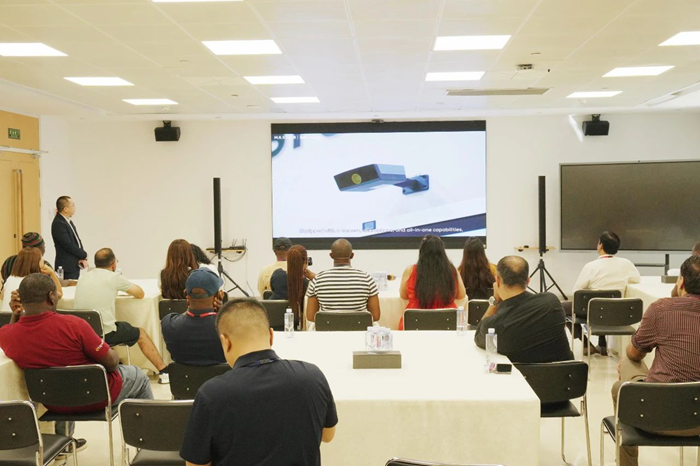 在視源股份蘇州產業園,視源股份海外事業群客戶總監何銀吉向參觀人員詳細介紹了公司的整體業務和發展情況。隨后,希沃江蘇子公司客戶顧問張文秀及其他同事,共同帶領參觀者體驗了希沃智慧黑板和交互智能平板。這些設備不僅能播放電子課件,而且主屏幕以及兩側的副屏幕都可用于書寫,滿足了教師日常上課的板書需求。其中,板書書寫功能和希沃白板的立體幾何工具贏得了參觀者的一致好評,使他們切實感受到了中國教育信息化實際應用成果。