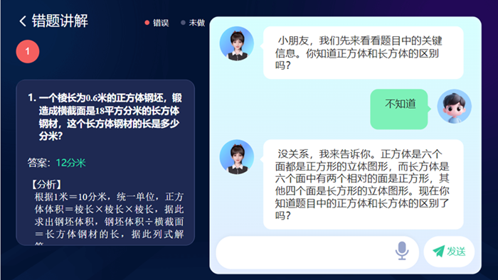 值得一提的是智能講題,當遇見特別棘手的題目孩子怎么也學不會時,用戶只要點擊右上角的”問老師“,AI老師就會進行“1v1”啟發式對話講解,讓孩子完全學透,并減少家長輔導壓力,在會場受到了參會各方的廣泛關注。