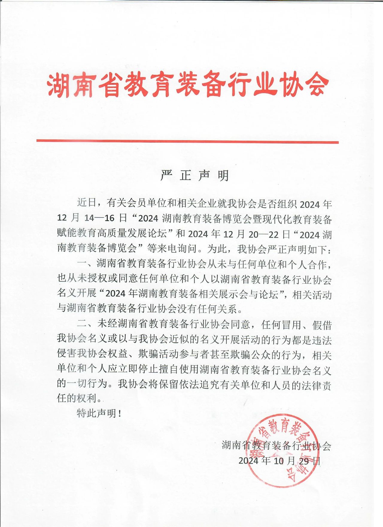 一、湖南省教育裝備行業協會從未與任何單位和個人合作,也從未授權或同意任何單位和個人以湖南省教育裝備行業協會名義開展“2024年湖南教育裝備相關展示會與論壇”,相關活動與湖南省教育裝備行業協會沒有任何關系。