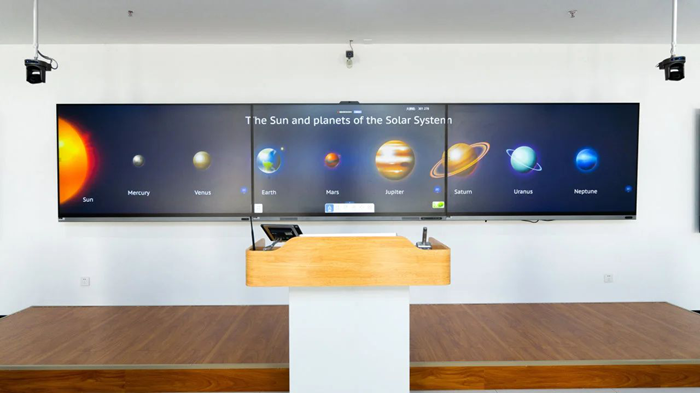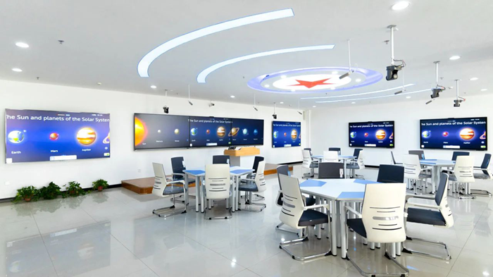 海信商用顯示助力河北外國語學院打造777間以雙屏智慧黑板為核心的智慧教室,集成智能監控、人臉識別系統,實現教學互動、設備管控,支持線上線下融合的教學模式,賦能教學場景的數字化轉型。