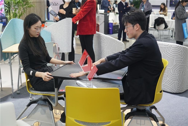 隨著教育信息化的深入推進,技術與空間的融合成為教育裝備發展的關鍵趨勢。在智慧教學區,KI展示了融合前沿科技與人體工學設計的課桌椅,吸引了眾多觀眾駐足。