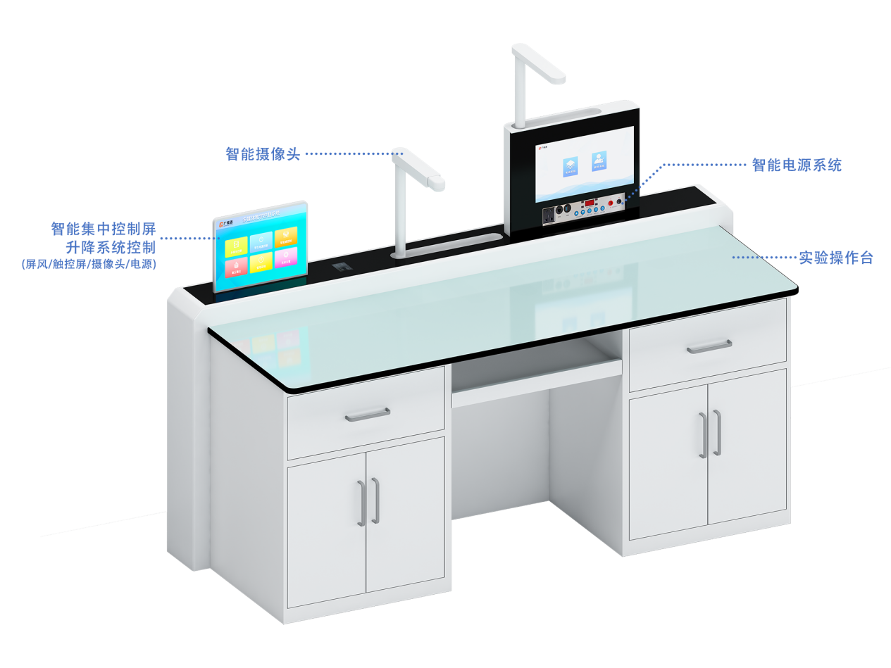 廣視通實驗室多功能演示臺配備了升降式智能終端和電腦及中央控制系統。它的功能是對實驗室水電風吊裝設備、升降式學生智能終端、實驗考試系統、學生實驗電源、教室多媒體設備等進行集中控制,打造高效課堂。