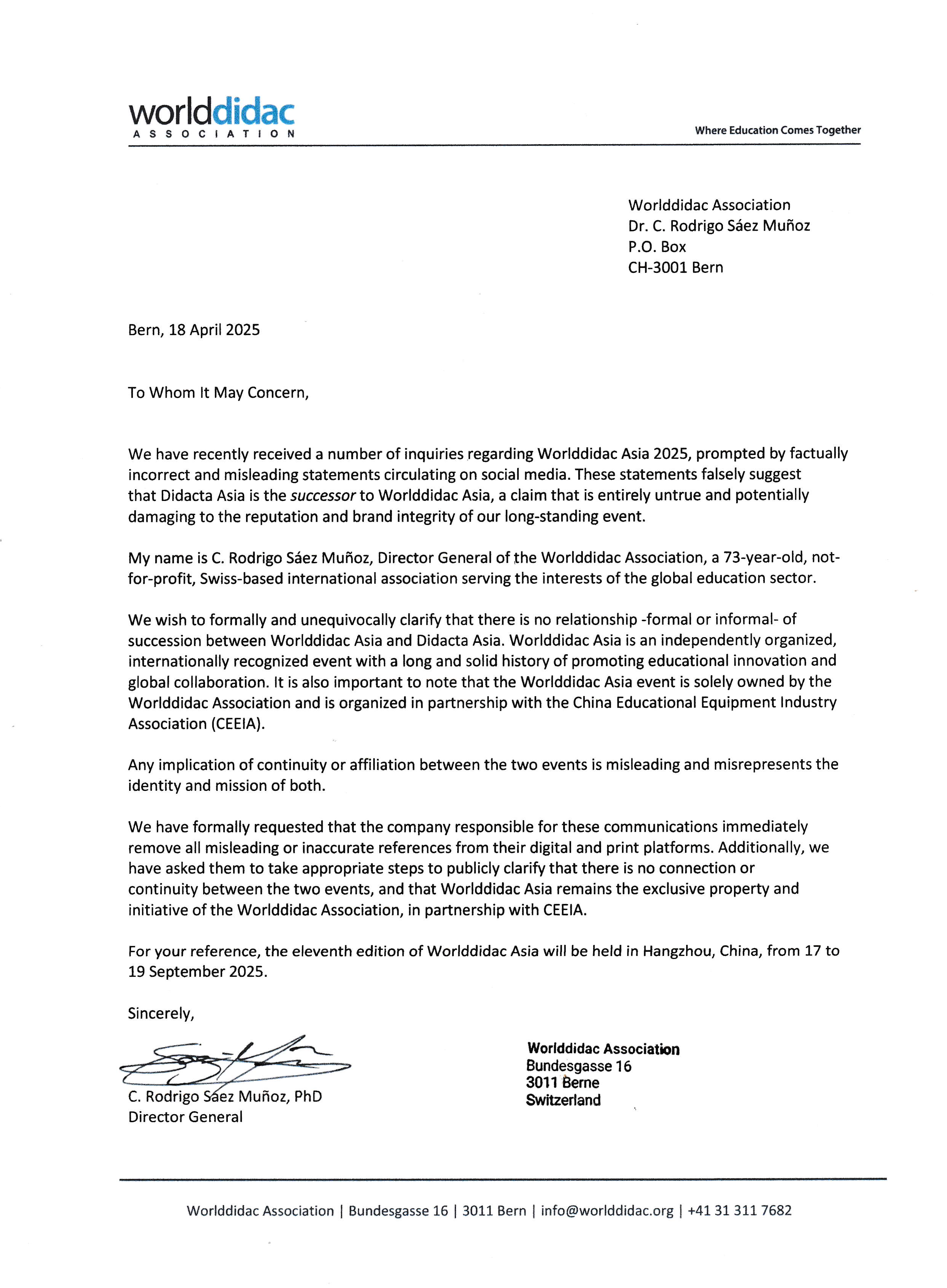 近期,我們收到一些關(guān)于"2025第十一屆亞洲教育裝備博覽會(huì)暨人工智能教育大會(huì)(簡稱:亞洲教裝展)"(Worlddidac Asia 2025)的問詢。我們發(fā)現(xiàn)有單位在社交媒體上傳播存在事實(shí)性錯(cuò)誤且具有誤導(dǎo)性的內(nèi)容,指出“亞洲教育博覽會(huì)”(Didacta Asia)是“亞洲教裝展”(Worlddidac Asia)的延續(xù)展。此說法完全失實(shí),并且可能導(dǎo)致我們長久以來的聲譽(yù)和展會(huì)品牌誠信受損。