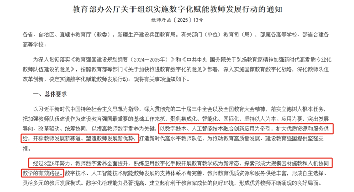 近日,教育部辦公廳正式發(fā)布的《關(guān)于組織實施數(shù)字化賦能教師發(fā)展行動的通知》(以下簡稱《通知》)明確指出,將以數(shù)字技術(shù)與人工智能技術(shù)的融合創(chuàng)新為發(fā)展引擎,著力開辟教師專業(yè)發(fā)展新路徑、構(gòu)建教育數(shù)字化轉(zhuǎn)型新優(yōu)勢;同時,經(jīng)過3至5年努力,教師數(shù)字素養(yǎng)全面提升,熟練應用數(shù)字化手段開展教育教學成為新常態(tài),探索形成大規(guī)模因材施教和人機協(xié)同教學的有效路徑。