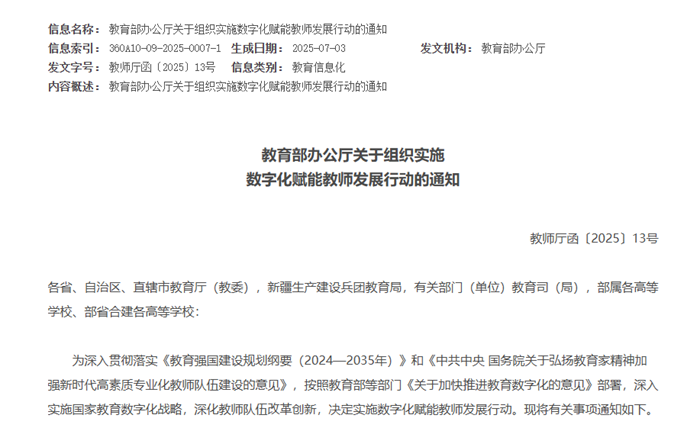 7月3日,教育部辦公廳發(fā)布關(guān)于組織實施數(shù)字化賦能教師發(fā)展行動的通知:按照教育部等部門《關(guān)于加快推進(jìn)教育數(shù)字化的意見》部署,深入實施國家教育數(shù)字化戰(zhàn)略,深化教師隊伍改革創(chuàng)新,決定實施數(shù)字化賦能教師發(fā)展行動。