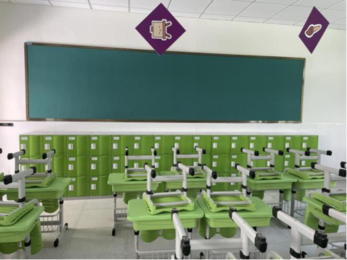 考慮到書包柜放置位置的特殊性,小學教室選擇的托普拉新一代儲物柜以安全防護為首要前提,門板軟角防護,解決教室空間狹隘取物、打鬧的磕碰問題。校方特意選用了與課桌椅同色系,整體視覺青春明快,與 “活力校園” 定位一拍即合。