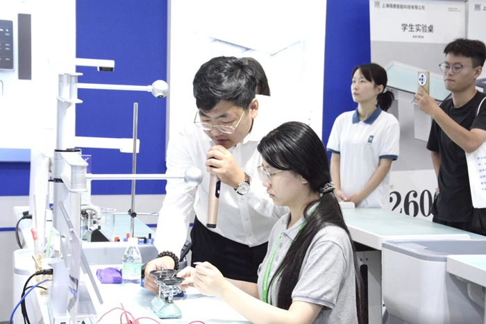 展會期間,上海錫鼎重點展示了勞動教育整體解決方案和AI智慧理化生實驗室整體解決方案兩大創新板塊。