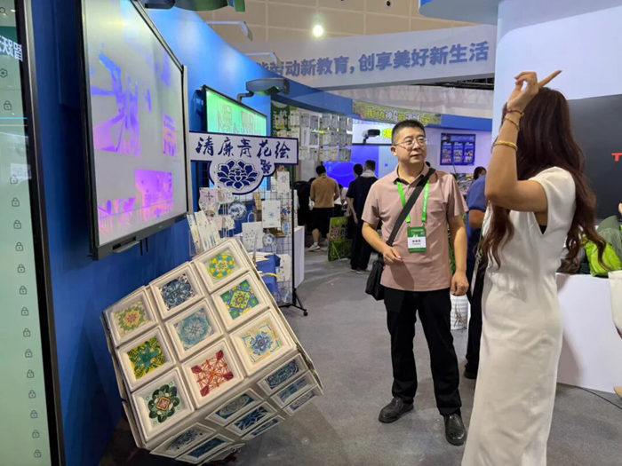 在展會現場,星瀾小學的展區布置別出心裁,懸空旋轉的“巨型”魔方以一角為支點悠然轉動,六個面上展示著孩子們創作的青花紋樣。元青花的纏枝蓮、明代的歲寒三友……傳統青花的紋樣在孩子們的畫筆下變換出了更為豐富的色彩和意蘊,吸引了眾多參觀者駐足欣賞。星瀾小學的唐海琴書記、沈建炬校長、美術教研組組長呂建韜老師在現場為前來參觀的教育專家、學者以及一線教師娓娓講解課程背后的“前世今生”,傳統文化與現代科學的創新呈現,深受參觀人員們的肯定。