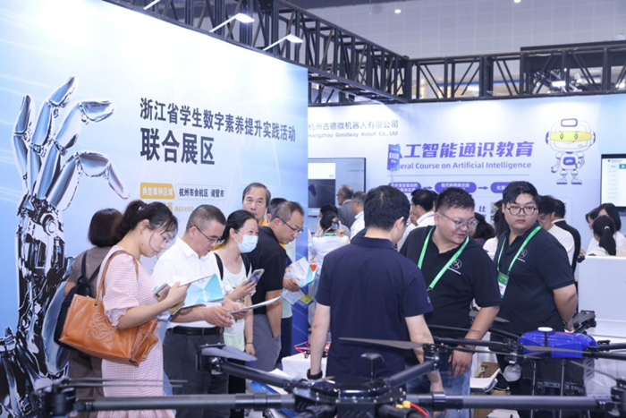 在浙江教育數(shù)字化展區(qū),“學(xué)在浙江”全民數(shù)字學(xué)習(xí)平臺、之江匯教育廣場、未來教室、云校在線課堂、教育元宇宙、中小學(xué)人工智能學(xué)習(xí)平臺等呈現(xiàn)未來教育創(chuàng)新實踐與優(yōu)質(zhì)資源共建生態(tài)。浙江11個設(shè)區(qū)市實踐各具特色,如杭州“城市大腦智慧教育”構(gòu)建起數(shù)字教育新形態(tài);麗水市聚焦“人工智能+教育”融合,五大維度打造“新教育”圖景等。浙江省學(xué)生數(shù)字素養(yǎng)實踐活動聯(lián)合展區(qū)展示了浙江學(xué)子在全國活動乃至世界賽場中取得的成績,展現(xiàn)出新時代浙江學(xué)生數(shù)字素養(yǎng)與人文精神交融共生的卓越風(fēng)采。