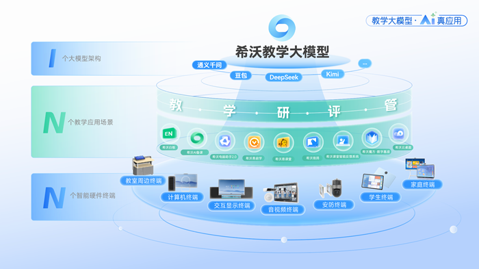 以希沃“1+N+N”AI技術體系實踐為例,希沃基于自研的希沃教學大模型基礎上,提出并構建「1+N+N」AI技術體系,即「1個希沃教學大模型架構+N個教學應用場景+N個智能硬件終端」,構建起覆蓋教學全鏈條、貫穿課堂內外、聚合行業(yè)中堅力量的教育數(shù)字化新生態(tài),成為升級“AI+教育”的技術底座。