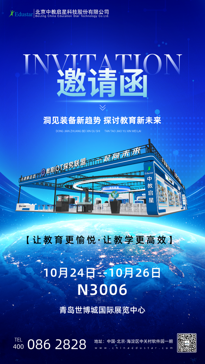 感謝您長期以來對中教啟星的信任與支持!第86屆中國教育裝備展示會開展在即,我們誠摯邀請您于10月24日-26日蒞臨青島世博城國際展覽中心N3006展位,期待與您相聚魅力青島,與我們共話未來、共謀發展。