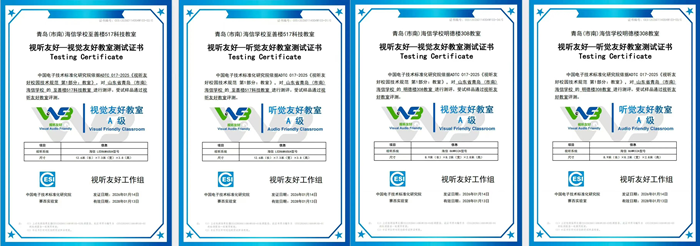 近日,青島海信學校作為首批國家級視聽友好校園試點單位,其兩間抽檢教室順利通過中國電子技術標準化研究院賽西實驗室首批國家級視聽友好認證測試,一舉斬獲視覺友好與聽覺友好雙A級認證證書!