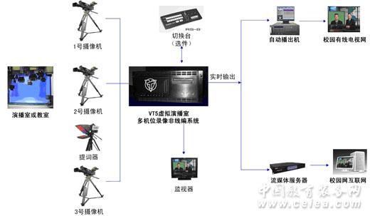虛擬輸出:可輸出到QQ視頻聊天、用戶自備的采集軟件上,廣泛擴展使用領域。 TALLY指示:通過并口實現與專業攝像機的通訊。 通道遙控切換:主要應用于精品課程的自動錄播,智能切換教師與學生機位。 (四)自動播出系統