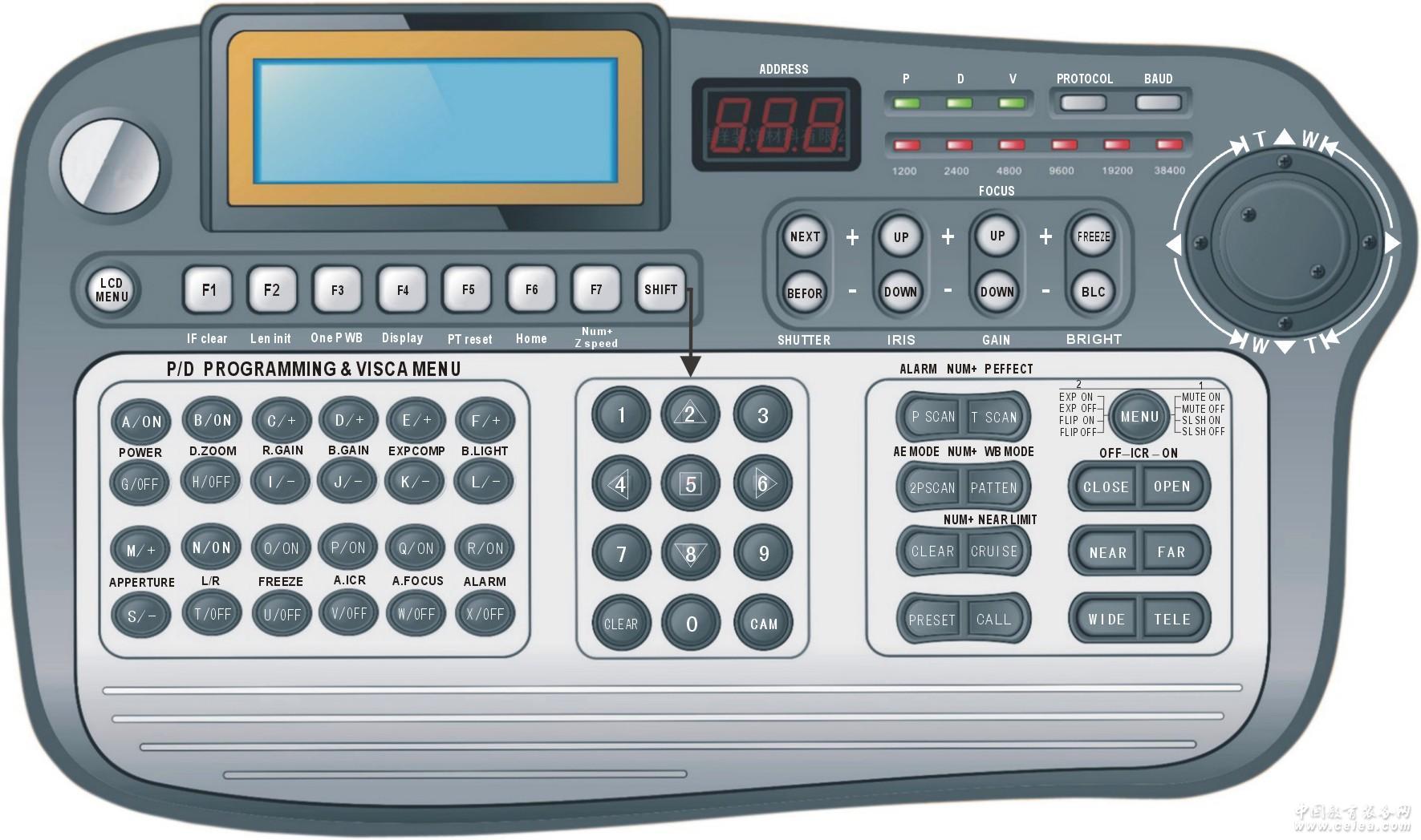 產品詳細介紹功能特點: ◆液晶顯示,直觀、方便、易懂、信息量大等優點。 ◆比例搖桿操作高速球和云臺,手感好,控制靈活,使用方便。 ◆鍵盤鎖定功能可避免其他非授權用戶操作鍵盤,安全性高。 ◆提供 RS422/RS485控制輸出信號,同時提供標準的RS232控制信號,方便近距離和遠程 ◆設備可編程控制 ◆控制模式:主控、分控 ◆最大可接入分控數:16 ◆最大可控制攝像機數:254臺(SONY D70P最多串聯7臺,是有SONY自身技術決定的) ◆最大可控制監視器數:64 ◆最大可控制解碼器數:1024 ◆通訊波特率:1200 bps~9600 bps ◆協議: PELCO_D、PELCO_P協議 ,SONY VISCA ◆數據格式:N,8,1 ◆供電電壓:AC/DC 9V~12V ◆功率: 5W |