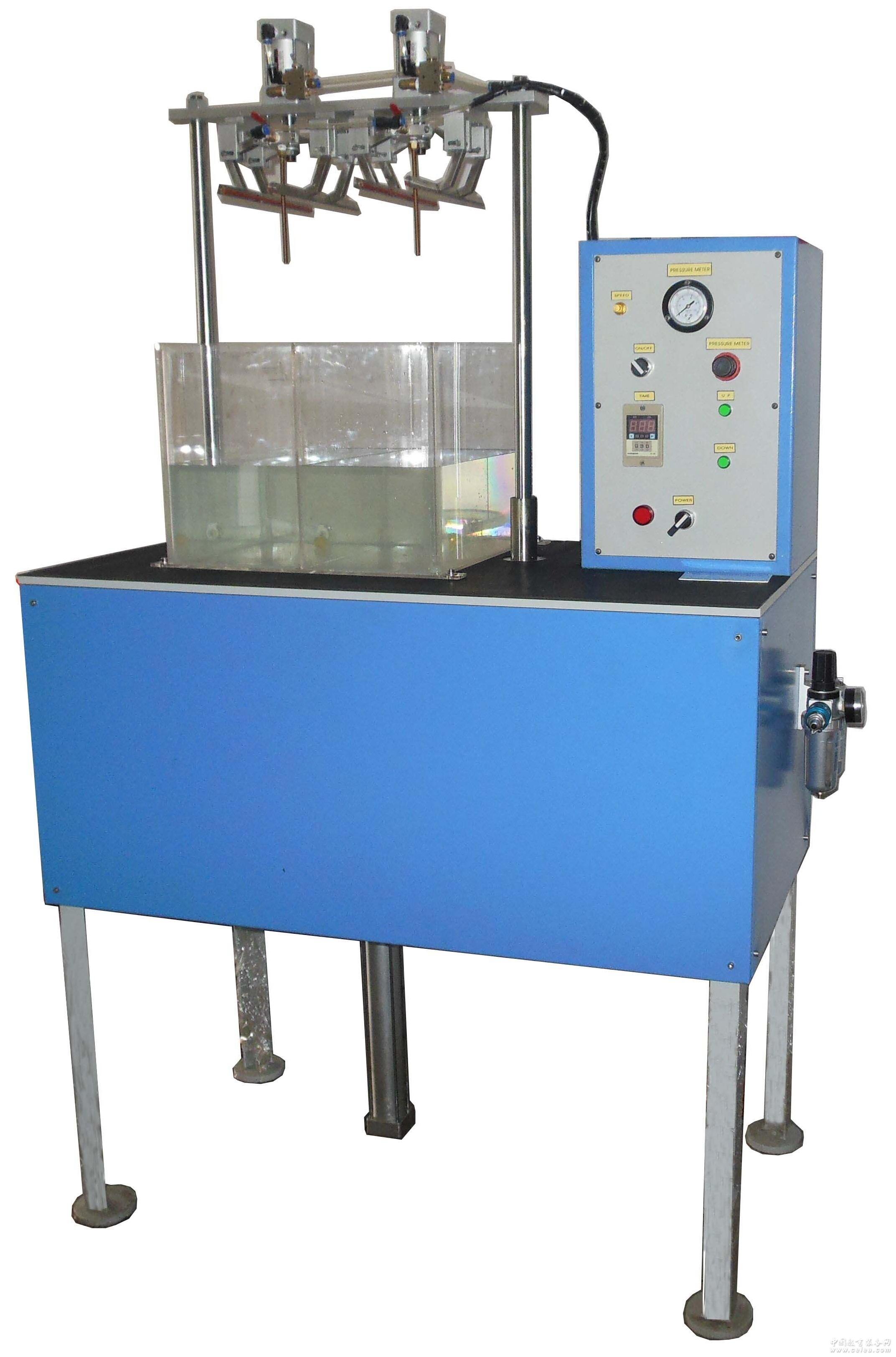 產品詳細介紹產品名稱:鞋襯耐滲水試驗機 產品型號:XK-3046 產品說明:鞋襯耐滲水試驗機適用于各種用途的膠面膠和膠靴(鞋)的耐滲水試驗。能快速檢出膠面膠鞋,鞋內襯套是否防水,本機可置于生產線上,對制品進行全檢,以全面控管制品之防水品質。測試時,以本機氣壓夾具,密封度件,并使夾具將試件帶入深之水中,同時充入定壓之空氣,只要試件滲水,立即產生氣泡,到達設定之測試秒數時,夾具自動帶著試件浮出水面。 工作原理: 充氣法:將試驗鞋(鞋)口密封,在被密封的鞋腔內充入一定壓力的壓縮空秘后放入水槽中,使水面距離試驗鞋口75mm以內,經過一定時間后觀察表面是否有氣泡冒出。 浸泡法:將試驗鞋(靴)浸入水中,使水面距離鞋口75mm以內,以過一定時間浸泡后取出并檢查是否有水滲入鞋中。 鞋襯耐滲水試驗機規格參數: 夾面夾具長度:220 mm 同時可試:2件(4件亦可承制) 夾具升降行程:320mm 充氣壓力:0~50kpa或指定(空壓機客戶自備) 水槽尺寸:42×42×32cm 計 時 器:LED,0~999秒 體 積:101×56.5×146.5cm 重 量:128kg 電 源:1∮,AC220V,2A