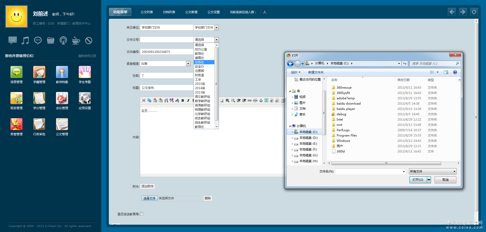 公文管理 根據(jù)每個(gè)學(xué)校公文的實(shí)際流轉(zhuǎn)過(guò)程自定義公文流轉(zhuǎn)模板, 進(jìn)行公文登記;同時(shí)可以接受上級(jí)教育主管單位的公文信息;在公文流轉(zhuǎn)的過(guò)程中,動(dòng)態(tài)的生成公文的流程圖;公文在流轉(zhuǎn)完成后系統(tǒng)自動(dòng)歸檔(備注:在公文流轉(zhuǎn)中出現(xiàn)人為操作錯(cuò)誤可以進(jìn)行公文撤銷)。