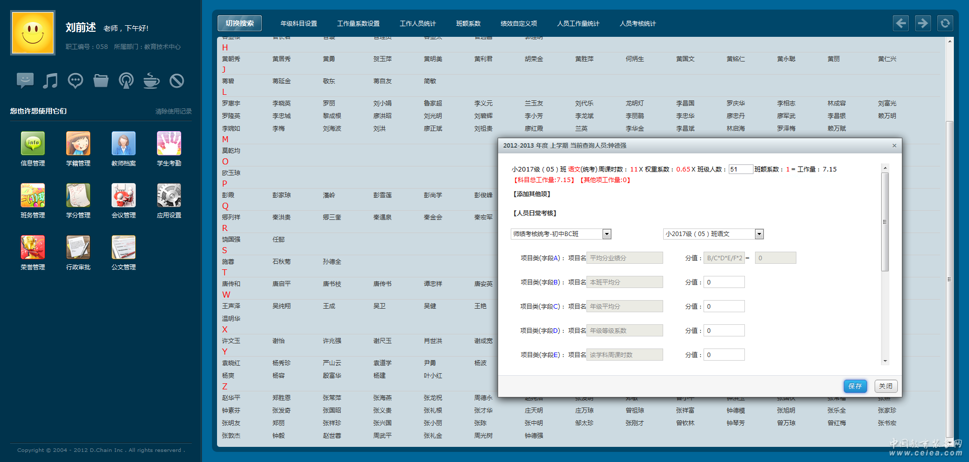 考核基礎設置 分年度學期對績效考核基本參數進行靈活設置,設置的內容包含班額系數的設置,每個年度學期年級設置統考及非統考科目,針對設置的統考及非統考的科目對畢業班和非畢業班設置相應的工作量系數。 考核自定義項 自定義設置考核辦法,針對考核辦法中的自定義項和計算公式采用自定義設置的方式,自定義項目采用字母編號的方式進行自動生成,同時自定義也可以采用批量導入的方式進行靈活設置。 人員工作量 用于生成每個教師的統考工作量、非統考工作量及自定義其他項工作量設置,并對考核辦法設置該教師對應的考核自定義項的值,也可以采用生成人員考核模板的方式,將考核的自定義其他項及自定義考核辦法的值進行批量導入,自定義考核辦法中針對計算公式采用負數歸零的計算方式。 工作量統計 用于生成各個教師工作量的詳細匯總報表,包含總工作、統考總工作量,以及統計報表的快速生成。統計報表采用分年度學期的生成模式。 考核辦法統計 根據年度學期自動加載對應的考核辦法數據,針對考核辦法生成對應的考核統計報表,支持下載。 |