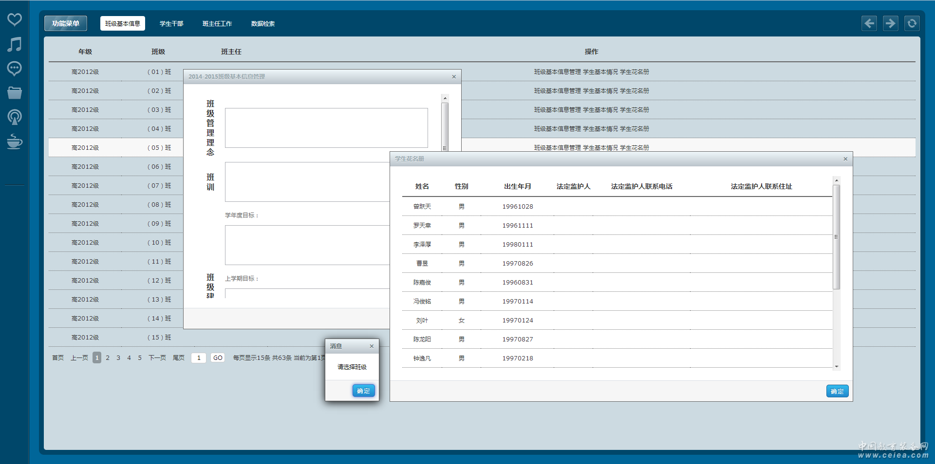 班級基本信息 主要是班主任在每個年度和學期對班級管理理念、班訓、班級建設總目標、班級上學建設目標、班級下學期建設目標、班主任學年工作總結等設置、班級花名冊、學生基本情況設置。 班主任工作 每個年度學期班主任對工作計劃、工作理念、工作感悟和反思的設置。 學生班干部 自定義設置學生干部類型、同時班主任設置本班的學生會、團委、班委、宿委、課代表、小組長的設置,并生成班干部報表。 晚自習管理 主要是班主任針對當前學期所執教班級學生上晚自習的設置,并生成學生上晚自習的報表。 新學期報到 主要是每個學期開始以后班主任針對學生的報道情況進行登記,同時對學生監護人信息、走讀方式、交通方式、是否上晚自習進行變更處理。 領導查看 主要包含每個年度學期對各個班級基礎信息(班級基本信息、學生花名冊、班主任工作)、學生干部、班主任工作進行查看匯總,并生成統計報表。 統計分析 主要是每個年度學期對學生的晚自習、學生的考勤、學生的新學期報道情況、學生住宿情況等進行統計并生成報表。 |