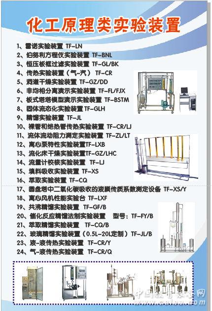 化工工藝類實驗裝置 1 多功能催化反應實驗裝置 TF-DGN 2 固定床催化反應實驗裝置 TF-GDC 3 流化床催化反應實驗裝置 TF-LHC 4 超濾微濾膜分離實驗裝置 TF-MFL/I 5 納濾反滲透實驗裝置 TF-MFL/II 6 噴霧干燥實驗裝置 TF-GZ/PW 7 催化劑顆粒內擴散實驗裝置 TF-NKS 8 乙苯脫氫實驗裝置 TF-TQ/YB 9 多釜串聯實驗裝置 TF-CL/DF 10 氣液平衡數據測定儀 TF-QYP 11 甲苯氧化制苯甲酸實驗裝置 TF-JZB 12 管式反應器實驗裝置 TF-GSF 13 液–液平衡數據測定實驗裝置 TF-YYP 14 液–液傳質系數測定設備 TF-YYP/II 15 液膜分離實驗裝置 TF-YM/F 16 催化裂解實驗裝置 TF-CL 17 氣升式環流反應器實驗裝置 TF-QH 18 特殊精餾實驗裝置 TF-JL/T