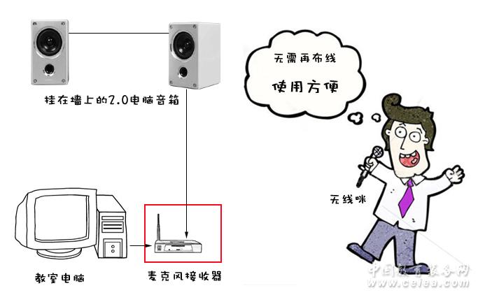 產品詳細介紹2.0電腦有源音箱的無線麥克風改造 珠海博納科技 越來越多的教室配置了多媒體教學設備,電腦、投影儀、音箱成為標配的教學設備。 越來越多的學校為教師提供了無線麥克風作為輔助教學設備,深受廣大教師喜愛。 客戶在與我們交流時提到如下問題:能否在現有音響設備的基礎上使用無線麥克風? 我們已經開發出了用于用于改造普通老舊有源音箱用的2.4G無線收發麥克風產品,但對于這種配合電腦用的2.0音箱沒有辦法。因為電腦用的2.0音箱沒有其他音頻輸入接口,麥克風信號無法接入。 若添置無線麥克風,需要相應的無線接收器、功放設備、音箱配套使用,增加較多的附加設備。最簡單的也是帶無線麥克風接收功能的有源音箱。這樣,黑板上方的墻上又增加了一對音箱。既有的有源音箱已經是學校的固定資產,全部換為新的2.4G無線有源音箱勢必造成國有資產的浪費,增加了不必要的經費。 所以客戶最希望能夠提供一種便捷、經濟的無線改造產品,使原來普通的有源音箱改造成為帶無線麥克風功能的擴音設備。 針對客戶上述需求,我們研發了改造設備。簡圖如下: 由圖中可見,改造很簡單。只需配置一套我們研制的改造用2.4G無線麥克風和接收器就可完成改造。改造后可達到如下效果: 1. 利用客戶原有的音箱進行麥克風擴音,無需增購新的擴音設備。 2. 在播放電腦等多媒體音頻的同時進行麥克風擴音。