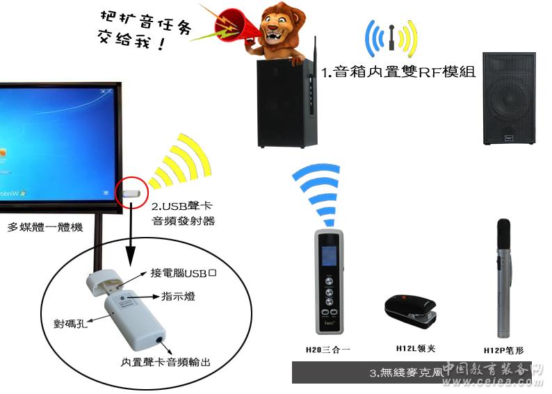 系統(tǒng)組成 系統(tǒng)無(wú)線有源擴(kuò)音音箱、USB聲卡無(wú)線傳輸器、無(wú)線麥克風(fēng)組成: 系統(tǒng)具有使用簡(jiǎn)單的特點(diǎn): 1. 音箱安裝完畢后,打開(kāi)電源就可以接收無(wú)線麥克風(fēng)信號(hào)以及教學(xué)一體機(jī)傳輸來(lái)的音頻信號(hào)。 2. 在多媒體一體機(jī)上插入U(xiǎn)SB聲卡發(fā)射器,打開(kāi)多媒體播放器,聲音就會(huì)無(wú)線傳輸?shù)接性匆粝溥M(jìn)行放大。 3. 在距音箱3米范圍內(nèi),打開(kāi)麥克風(fēng)電源開(kāi)關(guān)會(huì)自動(dòng)與音箱對(duì)頻可使用麥克風(fēng)擴(kuò)音 使用該系統(tǒng)有效的解決當(dāng)前電子白板擴(kuò)音音量小、使用無(wú)線麥克風(fēng)嘯叫的問(wèn)題。特別對(duì)已經(jīng)在教室使用的液晶電子白板等類似設(shè)備具有無(wú)需重新布線,即插即用優(yōu)點(diǎn)。